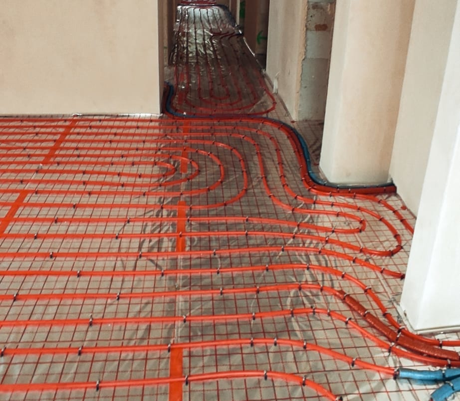 Najpierw na „chudy beton” (mieszankę betonową o małej zawartości cementu stosowanej jako podkład do posadzek) układamy styropian, który stanowi izolację cieplną oraz ekran odbijający ciepło. Na tak przygotowanej powierzchni mocuje się, za pomocą spinek, rury, prowadzące wodę. Można także zastosować styropian z gotowymi wyżłobieniami, w których z łatwością układa się rury. Długość jednego obiegu grzewczego nie może być większa niż 100 metrów (długość zależy od przekroju rury), dlatego zazwyczaj wykonujemy kilka obiegów grzewczych. Dzięki temu użytkownik ma pełną kontrolę nad temperaturą w poszczególnych pomieszczeniach.